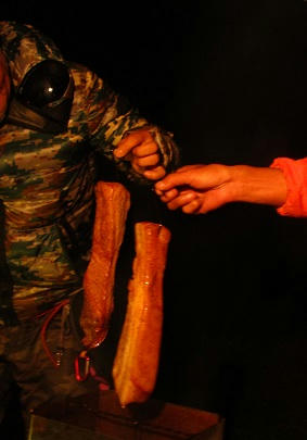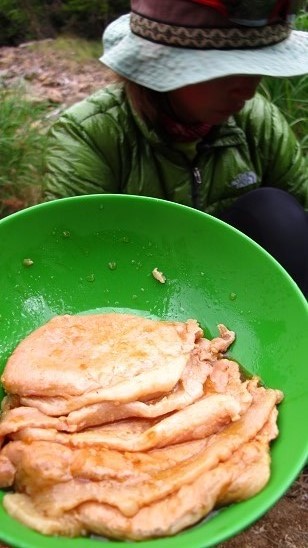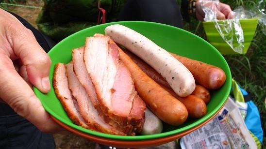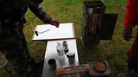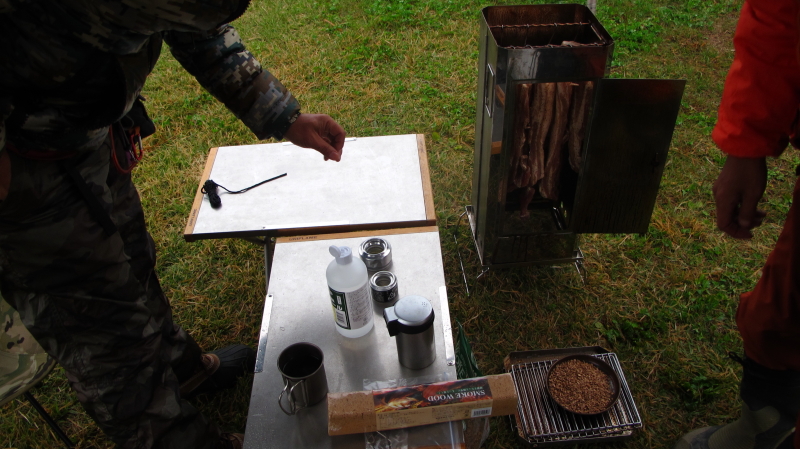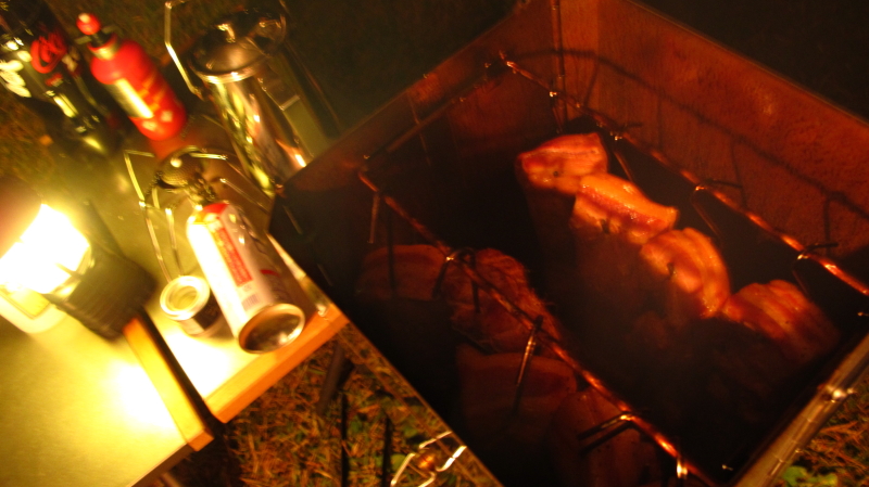 ・・と、今回のキャンプのメインはスモークベーコン作り\(^o^)/ ベーコンの塩ぬき,風乾をしている間に、ちょっとお買いものがてら、お昼は外でご飯を食べて、またいなかの風に戻ってきて焚火をしながらまったり☆ ・・と伊那にお住まいのヤマ友さんが、私たちキャンプサイトに遊びに来てくれました!『ようこそ!わが家の日曽利(ヒッソリ)にいらっしゃいませ~♪』あれ?何だかちょっと違う?(笑) そして、今日は3人一緒にスモークベーコン作りでモクモク♪ 焚火を囲みながら楽しくおしゃべりしながらモクモク♪そして!出来立てホヤホヤな熱々ベーコンとゴハンを食べお腹もいっぱい!雨は1日降り続きましたが、この日は夜まで楽しいキャンプを過ごすことができました♪