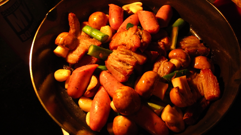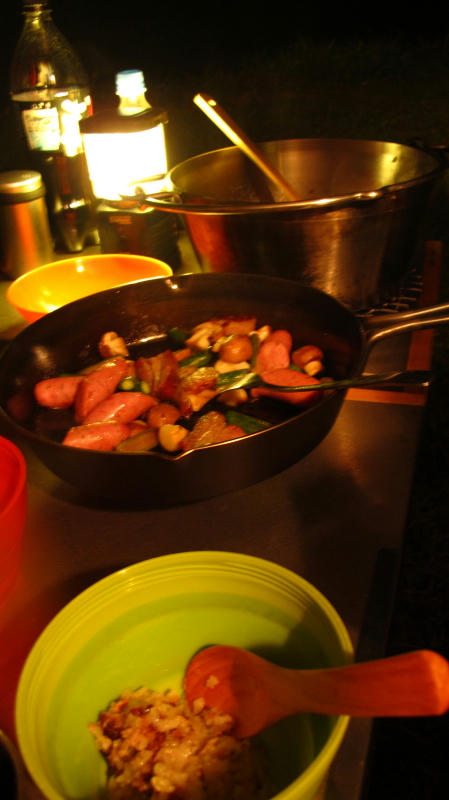 フランクフルトを火であぶって食べたり、ありがとうのタケノコのおひたしなどを食べて~